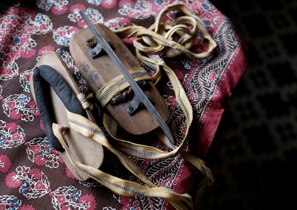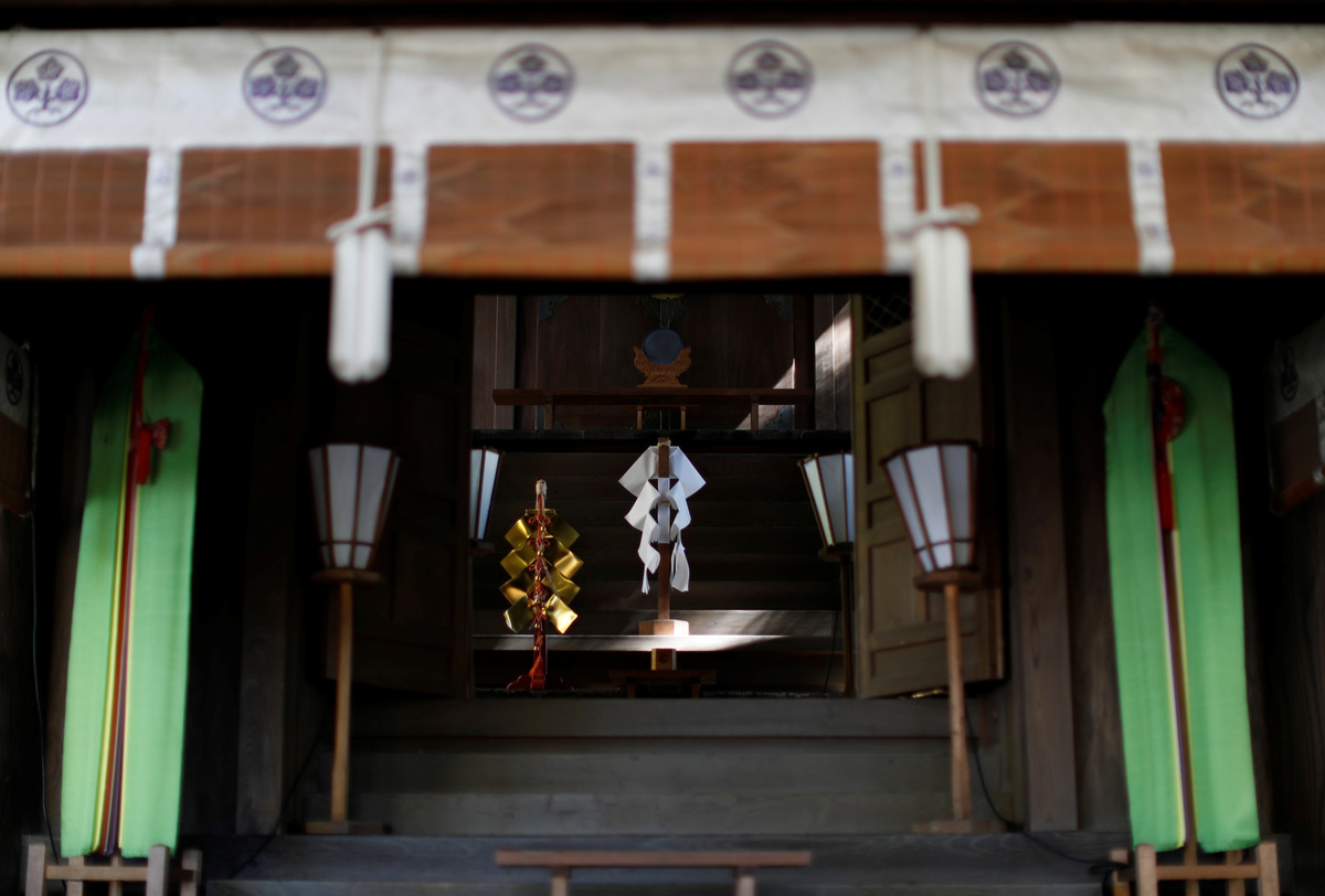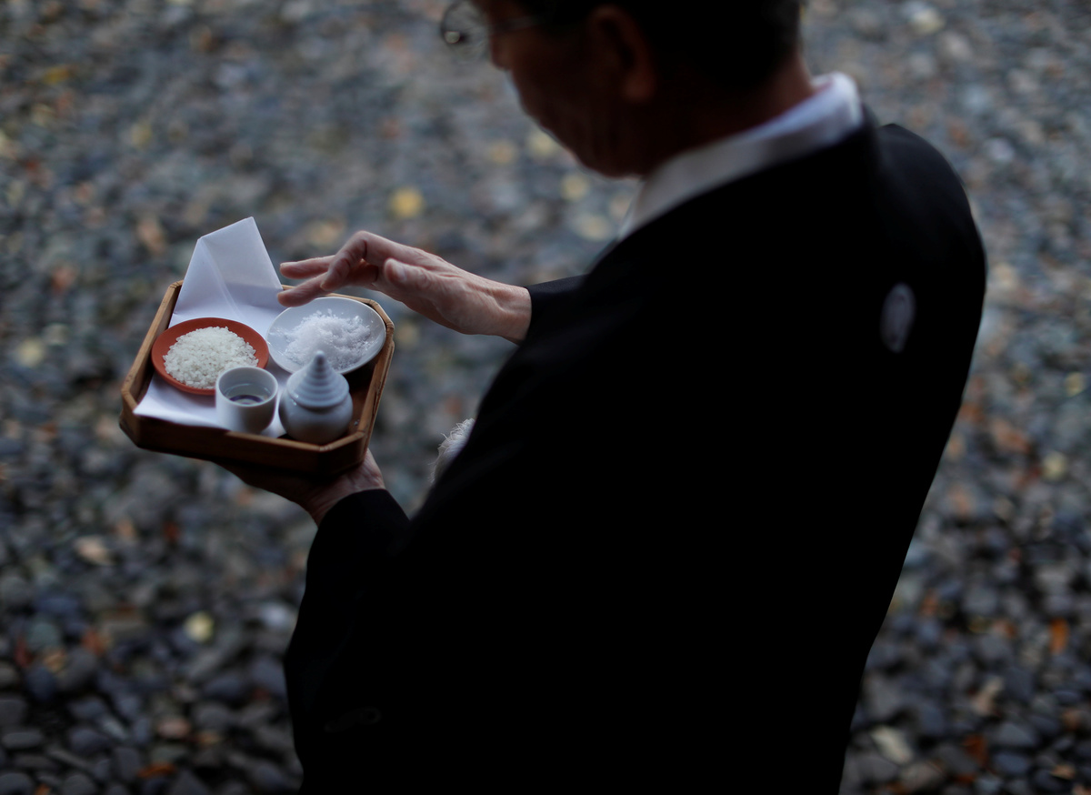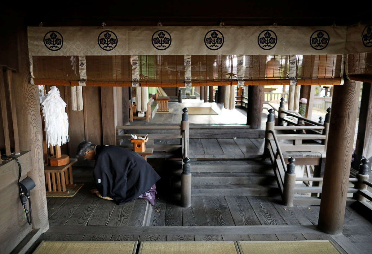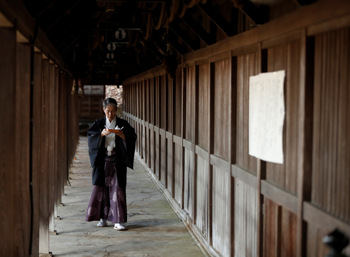 It is an unseasonably warm November morning. The trees only changed shades a few weeks ago, and the steep hill behind the shrine looks as though it's on fire. The 69-year-old eventually puts down the roaring machine and sweeps up the lingering leaves into neat piles. Then he changes into formal robes to offer a tray of rice, sake, salt and water at the shrine's altar, and begins his prayers.