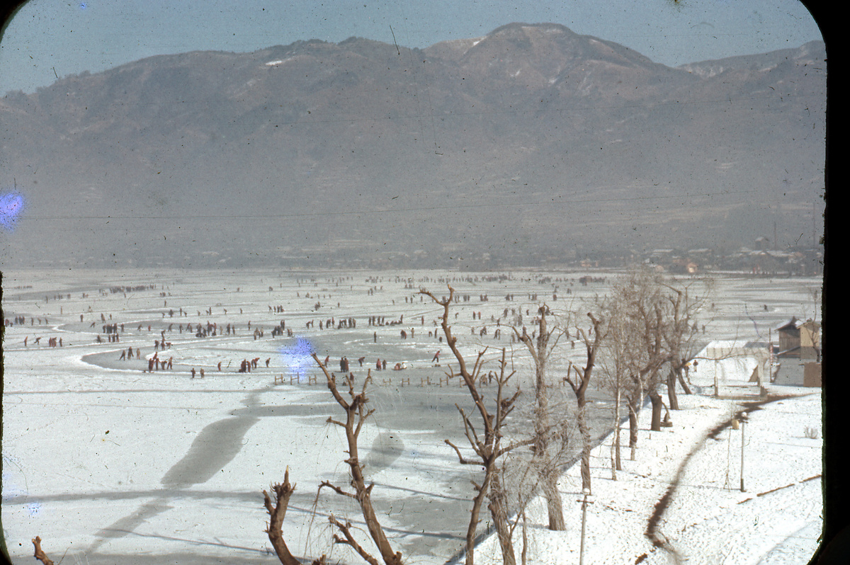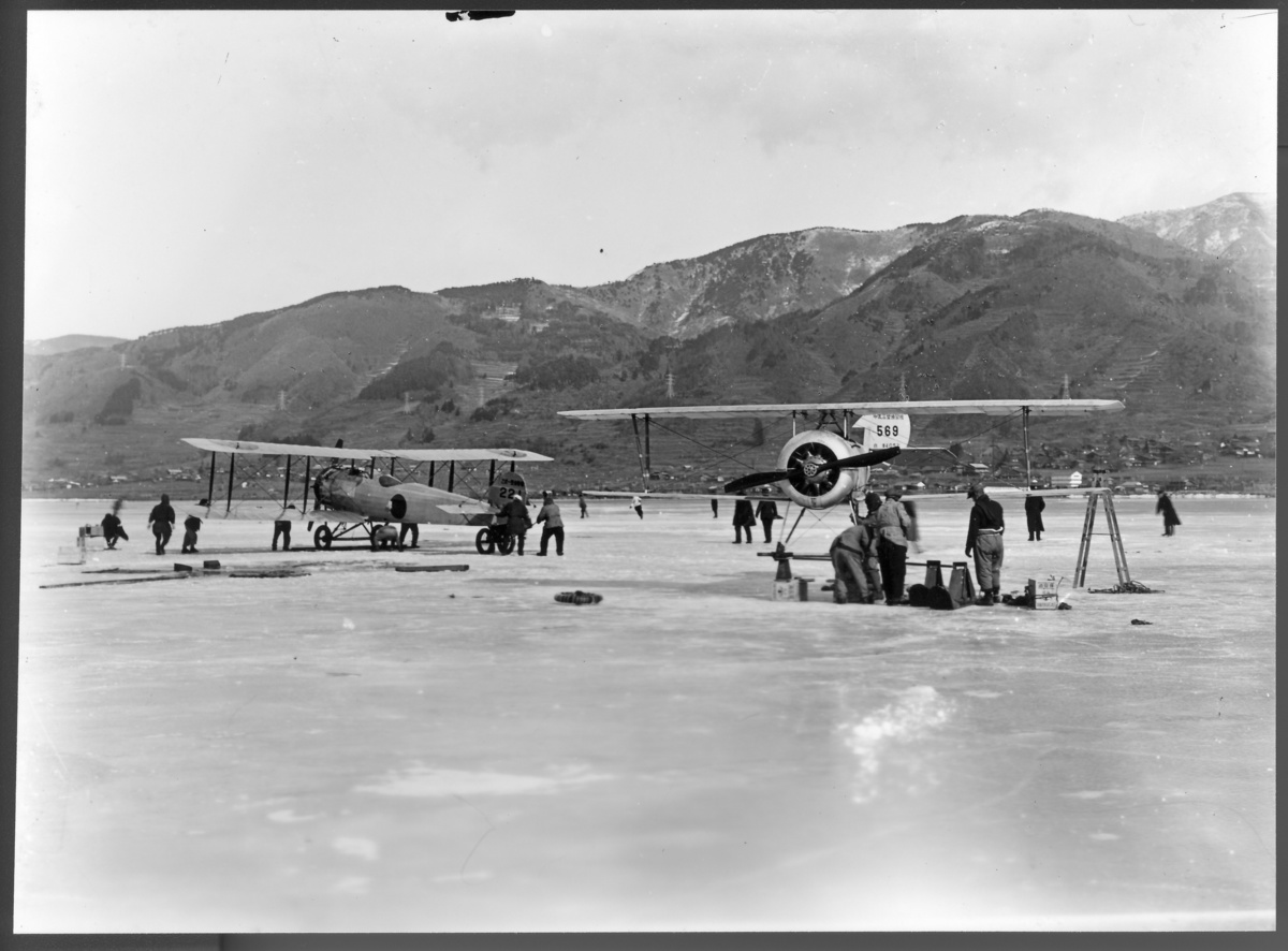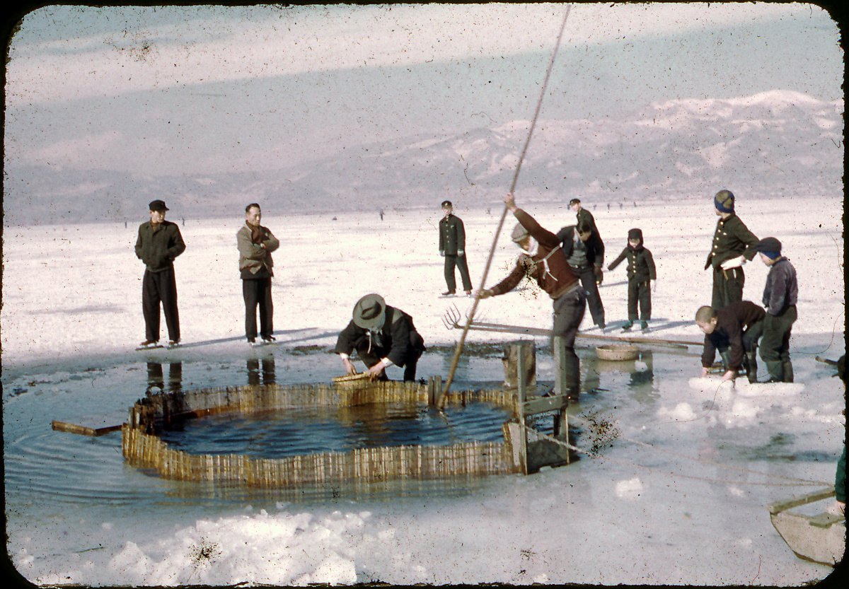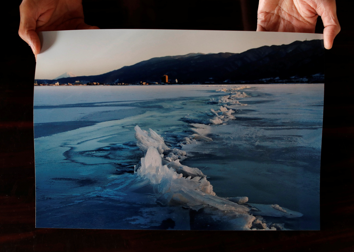 Miyasaka flips through a folder filled with newspaper clippings and photographs of the lake. In one laminated black-and-white picture, local firemen pose in front of a fighter plane that landed on the lake ice during a military exercise before World War II. In another, more recent photograph, Miyasaka and a group of local leaders stand precariously on the lake to examine an ice fracture beneath their gumboots.