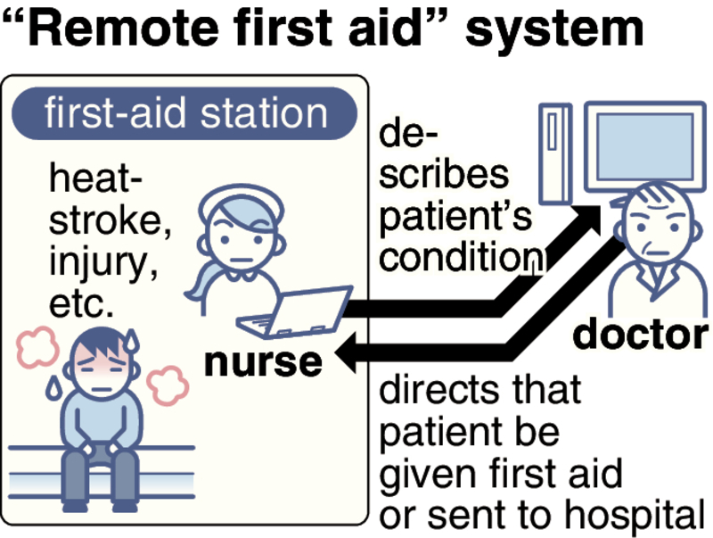 Under the system, the condition of those who suddenly become ill will be relayed by video and other means from first-aid stations to doctors, who will then instruct nurses at the stations to give the patients first aid or send them to the hospital for further treatment.