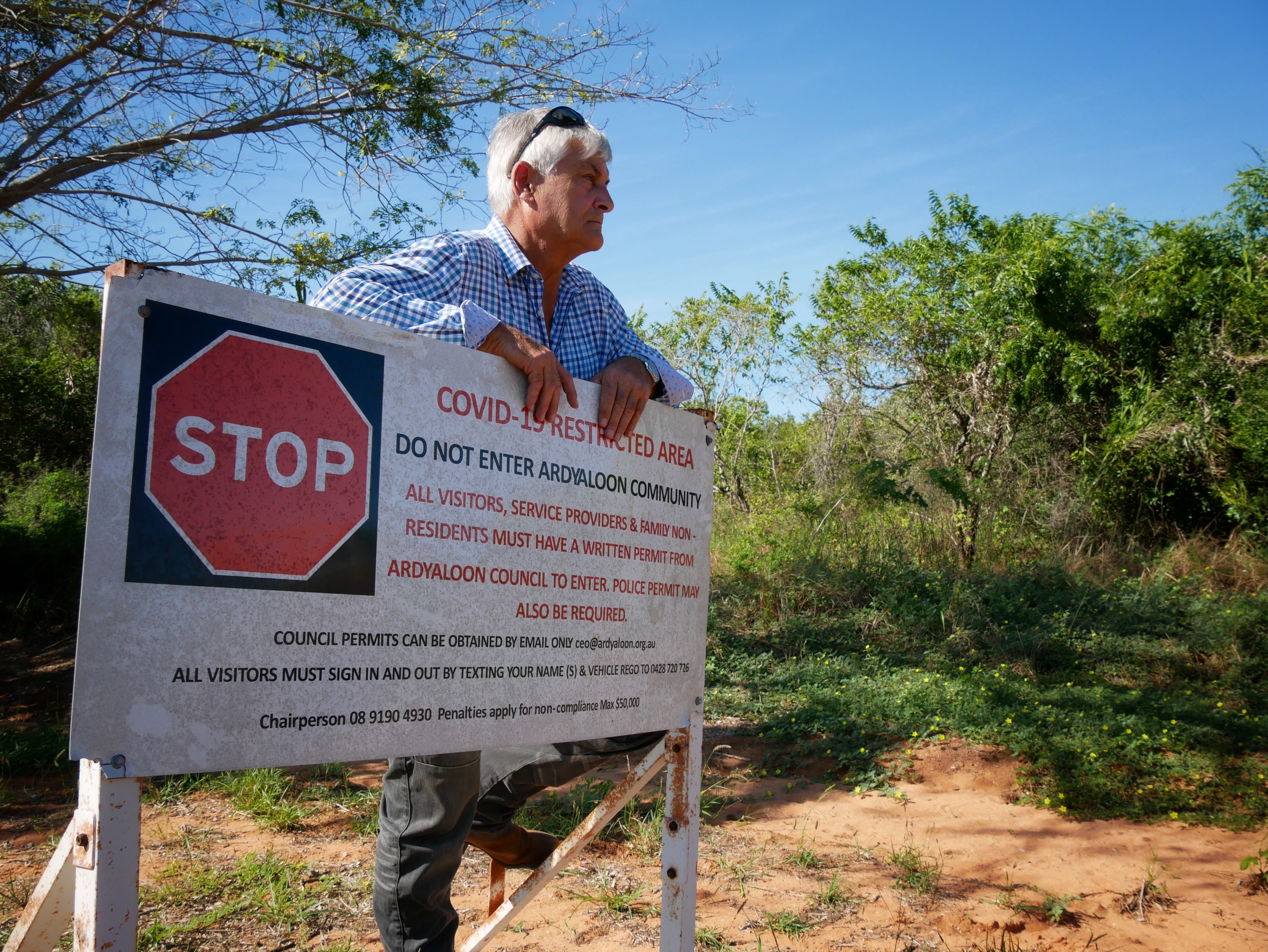 Colin Woodman reflects on the pandemic as he removes the barriers that have blocked the entrance to the Ardyaloon community, north of Broome in WA's Kimberley, for more than two years.