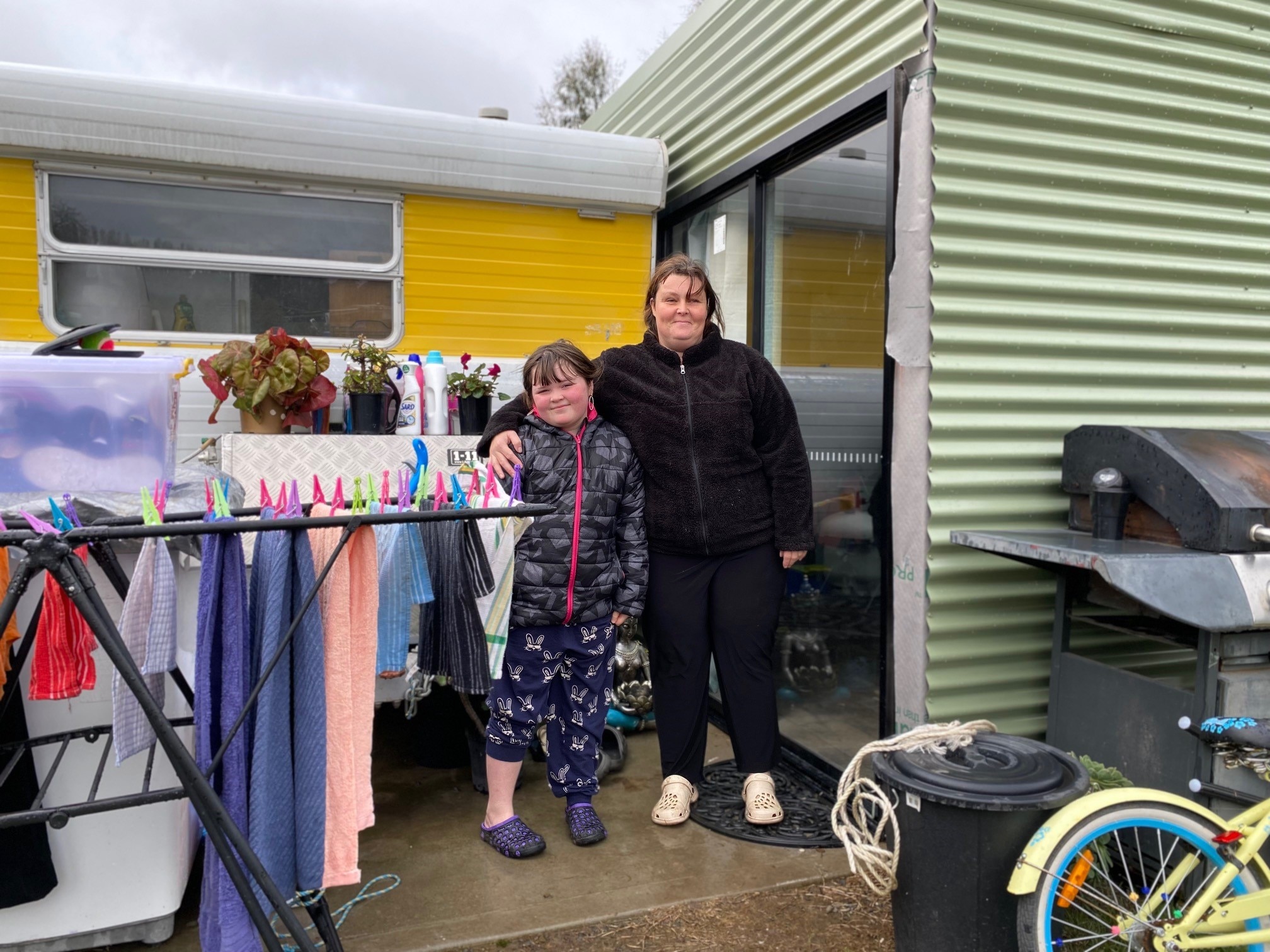 Leah Jones and her eight-year-old daughter Emma have lived at the Huonville caravan park for almost 10 months.