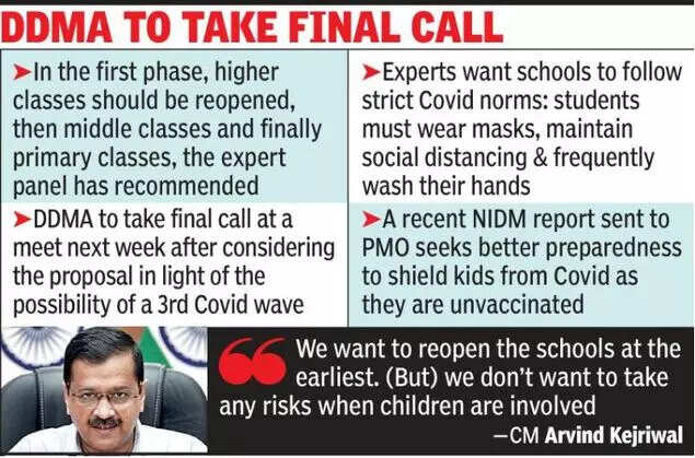 NEW DELHI: A committee of experts constituted by Delhi Disaster Management Authority (DDMA) has suggested reopening of schools in Delhi for all classes in a phased manner from next month in the wake of significant improvement in the Covid-19 situation.