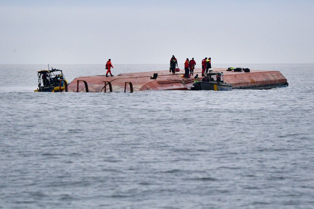The pre-dawn collision with the Danish-flagged “Karin Hoej” happened Monday in foggy weather. The Danish ship capsized fully and was left floating upside down.