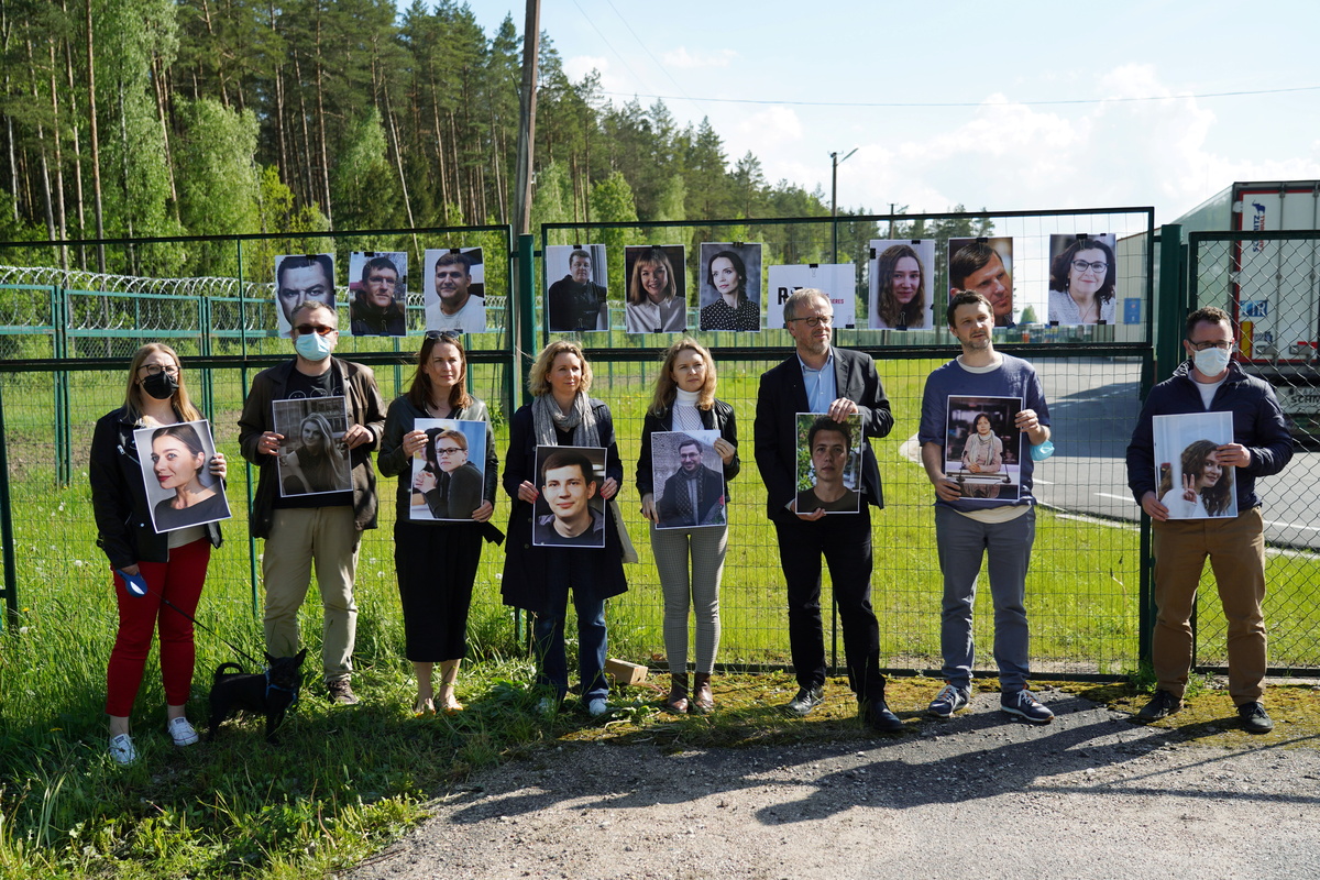 He and a dozen Lithuanian and Belarusian protesters held pictures of journalists jailed in Belarus, including Protasevich.