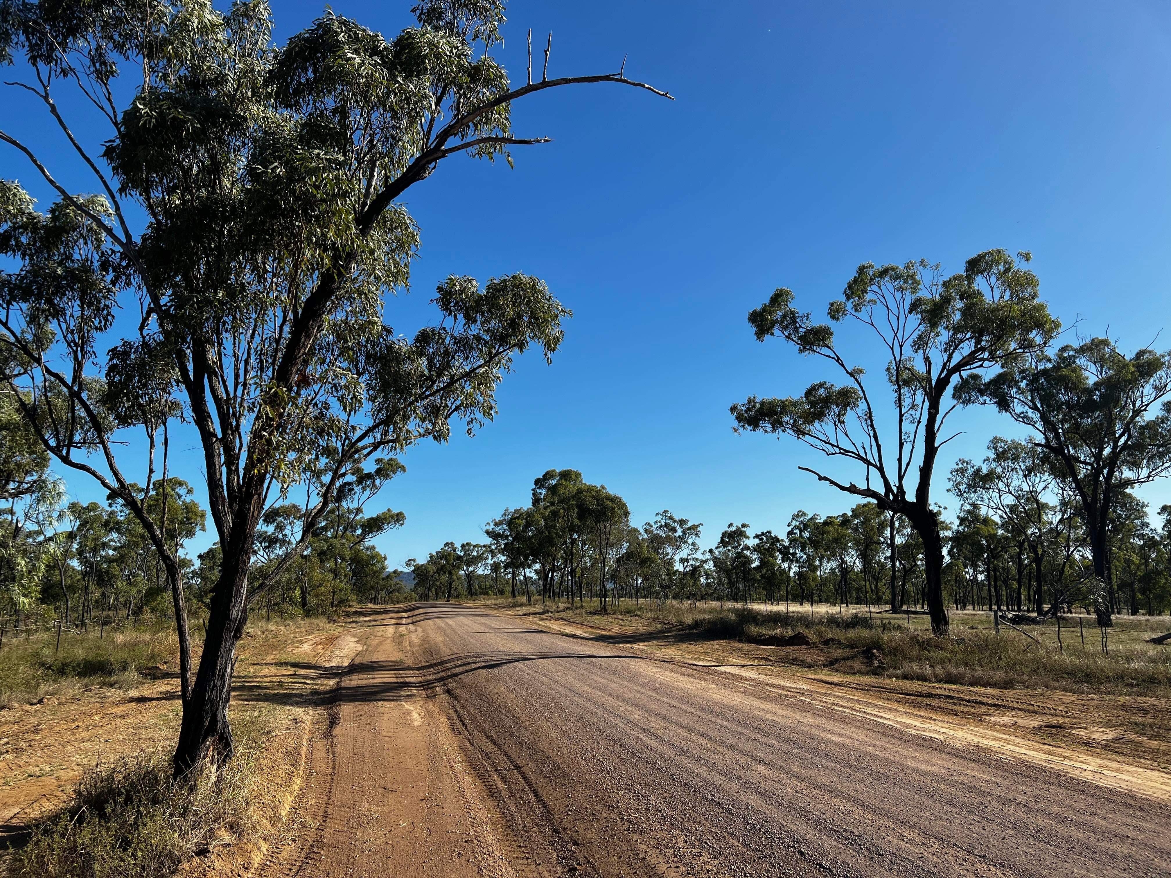 Large farming properties line the dirt road all the way out to the exclusion zone.