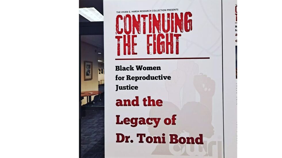 Archivists at Harsh have recently curated a display of Bond’s collection in the lobby of Woodson at 95th and Halsted. There’s swag and flyers from organizations she founded. Surveys given to Black women about their bodies. Newsletters written about barriers to reproductive health, a breast self-examination kit, meeting notes from the Obama-Biden Presidential Transition Team on its reproductive health meeting.