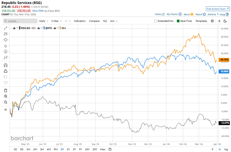 RSG stock has underperformed the broader markets over the past 52 weeks, with shares down 8.1%, compared to the S&P 500 Index's ($SPX) 15.5% gain and the State Street Industrial Select Sector SPDR ETF's (XLI) 22.2% return over the same period.