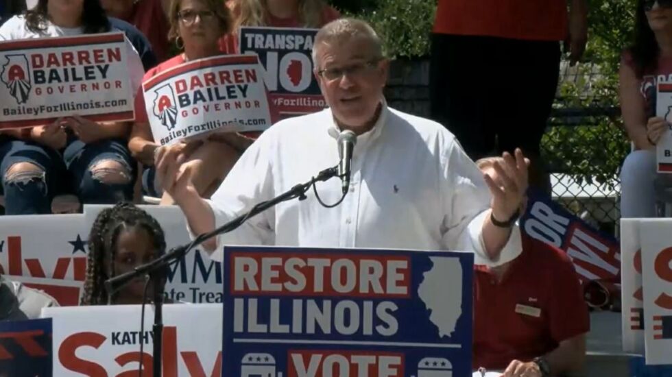 Bailey once again called Chicago a “hellhole” during his rally remarks, blaming crime on “legislators going soft on criminals” and pointing fingers at Pritzker, Cook County State’s Attorney Kim Foxx and Chicago Mayor Lori Lightfoot. Asked later if he believes “most Chicagoans” feel they live in a “hellhole,” Bailey said yes.
