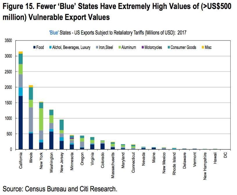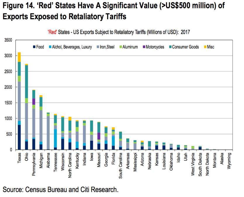 That’s according to economists at Citi, who last week published a research note on which US states are most exposed to a trade war and what this means for the midterm elections.