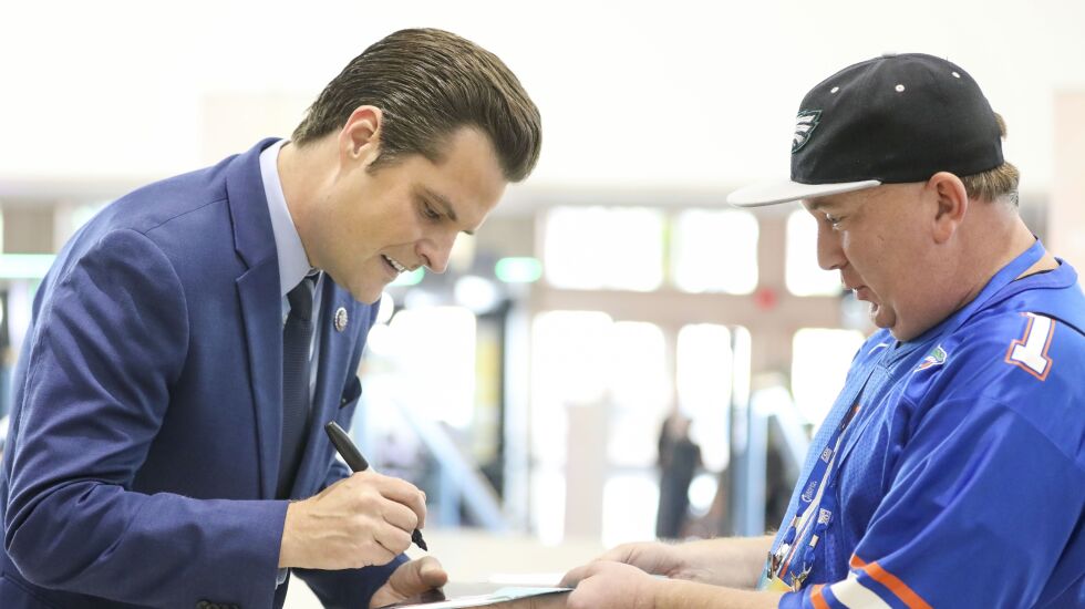 Rep. Matt Gaetz autographs a picture during Turning Point’s annual Student Action Summit at the Tampa Convention Center in Tampa, Florida. (Ivy Ceballo/Tampa Bay Times via ZUMA Press Wire)