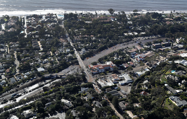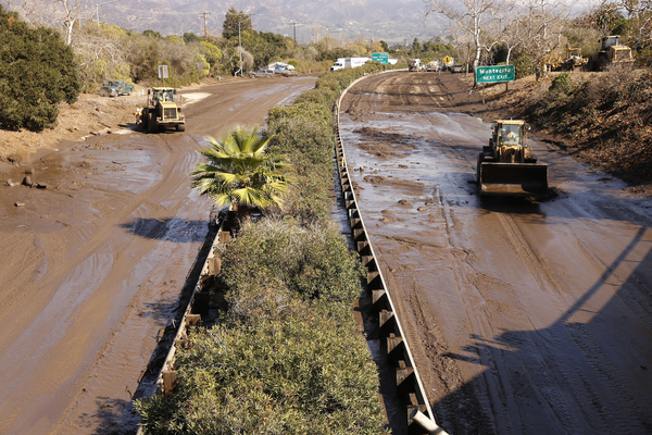 The surge destroyed or damaged hundreds of buildings in Montecito and washed out a 30-mile stretch of the 101 Freeway. The roadway will remain closed until at least Monday from Highway 150 to Milpas Street in Santa Barbara as crews work around the clock to clear the area of mud, cars and other debris. On the stretch of the freeway by the Montecito Inn, several feet of mud and rubble collected in the road.