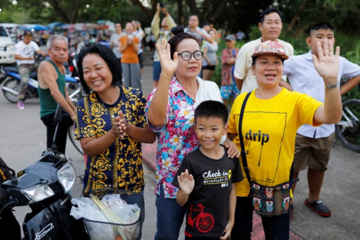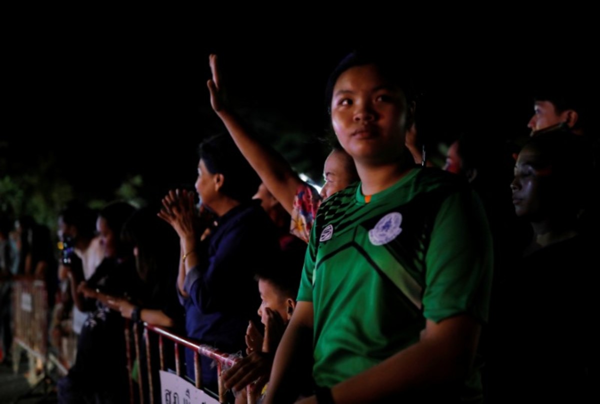 Onlookers wave as the last ambulance leaves a military airport in Chiang Rai, Thailand, July 10, 2018. REUTERS/Tyrone Siu