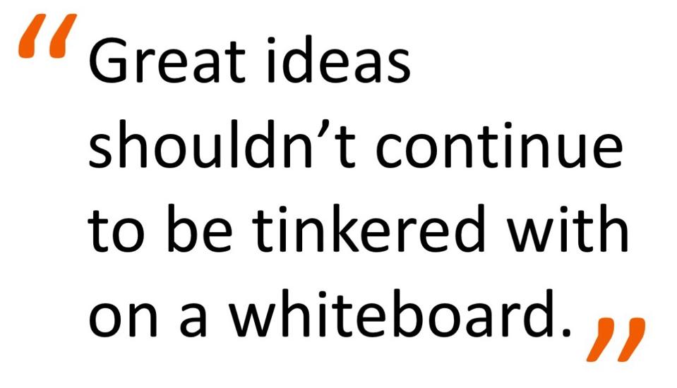 In other words, great ideas shouldn’t continue to be tinkered with on a whiteboard. They need to be implemented with room for adjustment, expansion and iteration. You can’t position invention within the lines of convention. That’s how innovation gets boxed in.