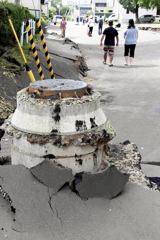 SAPPORO -- Damage caused by the powerful earthquake that struck Hokkaido on Thursday included a road that collapsed in a residential area of Kiyota Ward, Sapporo, after burst water pipes submerged it in water.