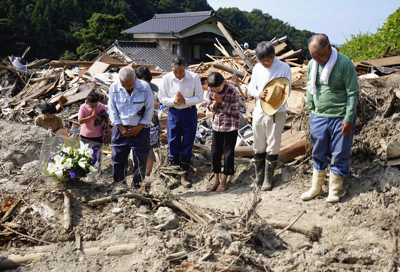 SHUNAN, Yamaguchi -- Tuesday marked one month since the extent of the damage caused by deadly torrential rains in western Japan became clear. Ten residents of the Higuchi district in Shunan, Yamaguchi Prefecture, gathered on the day to pray for the soul of Noriko Kawamura, 64, at the site where she was killed when a landslide demolished her house on July 7. Her husband and two sons were injured, according to residents.