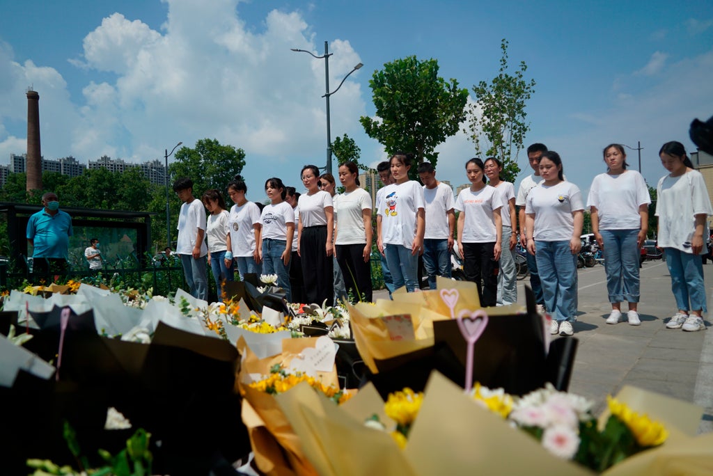 “I’m filled with grief,” said Zhengzhou resident Zhang Shuai 35, who bowed three times in front of the entrance after laying a bouquet of chrysanthemums. “I hope that their relatives can recover from this tragedy as soon as possible.”
