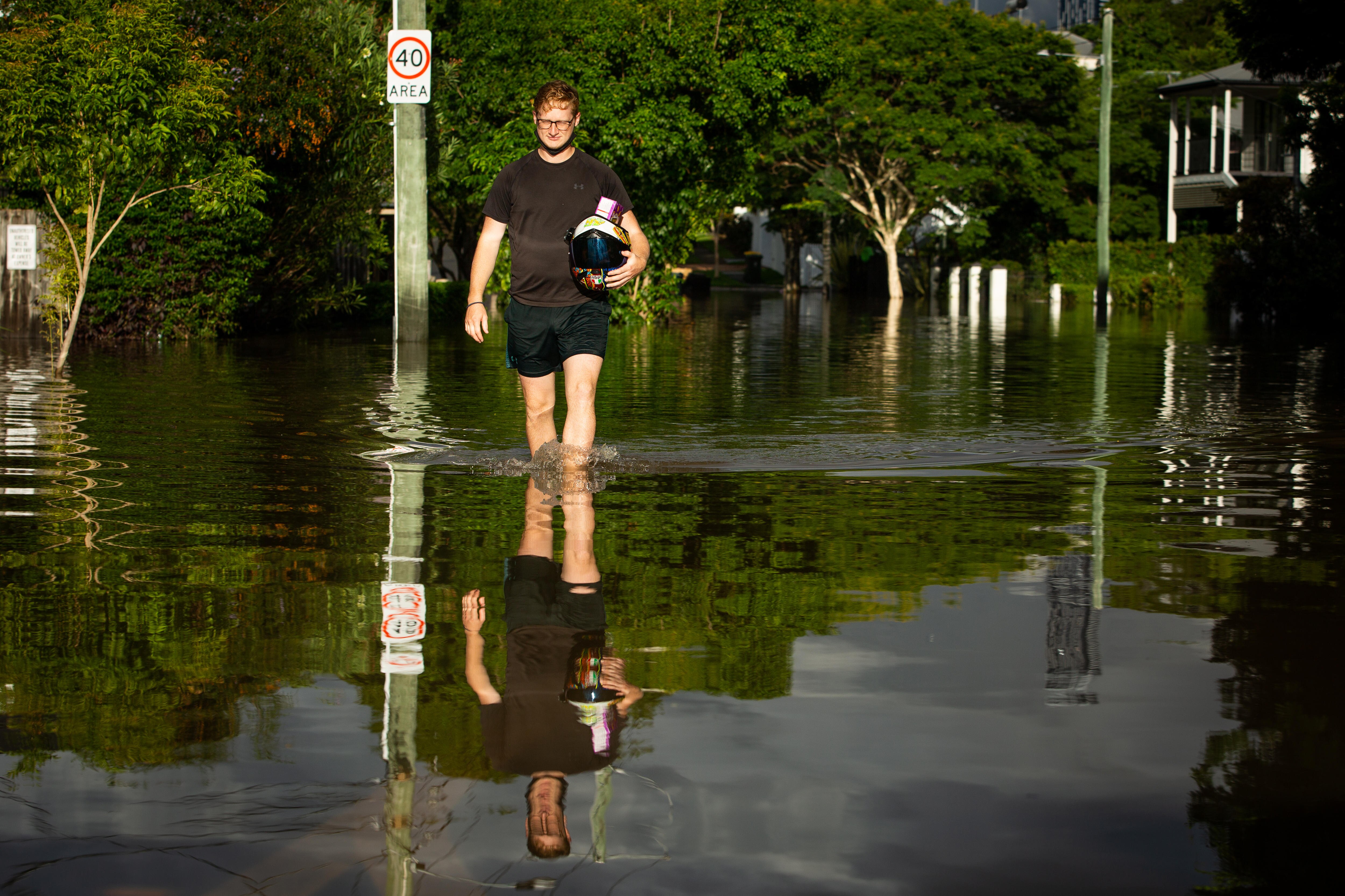 Expecting to be away for a while, he waded through knee-deep water to salvage two important items — his motorcycle helmet and a box of savoury biscuits.
