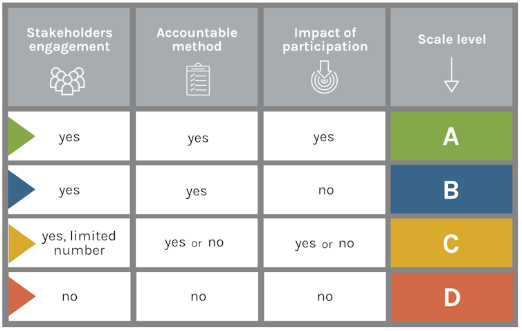 Both the design brief and the assessment tool rely on the four-level rating scales for each attribute, where “A” represents a high level of responsibility and “D” indicates that there are no particular signs of responsibility.