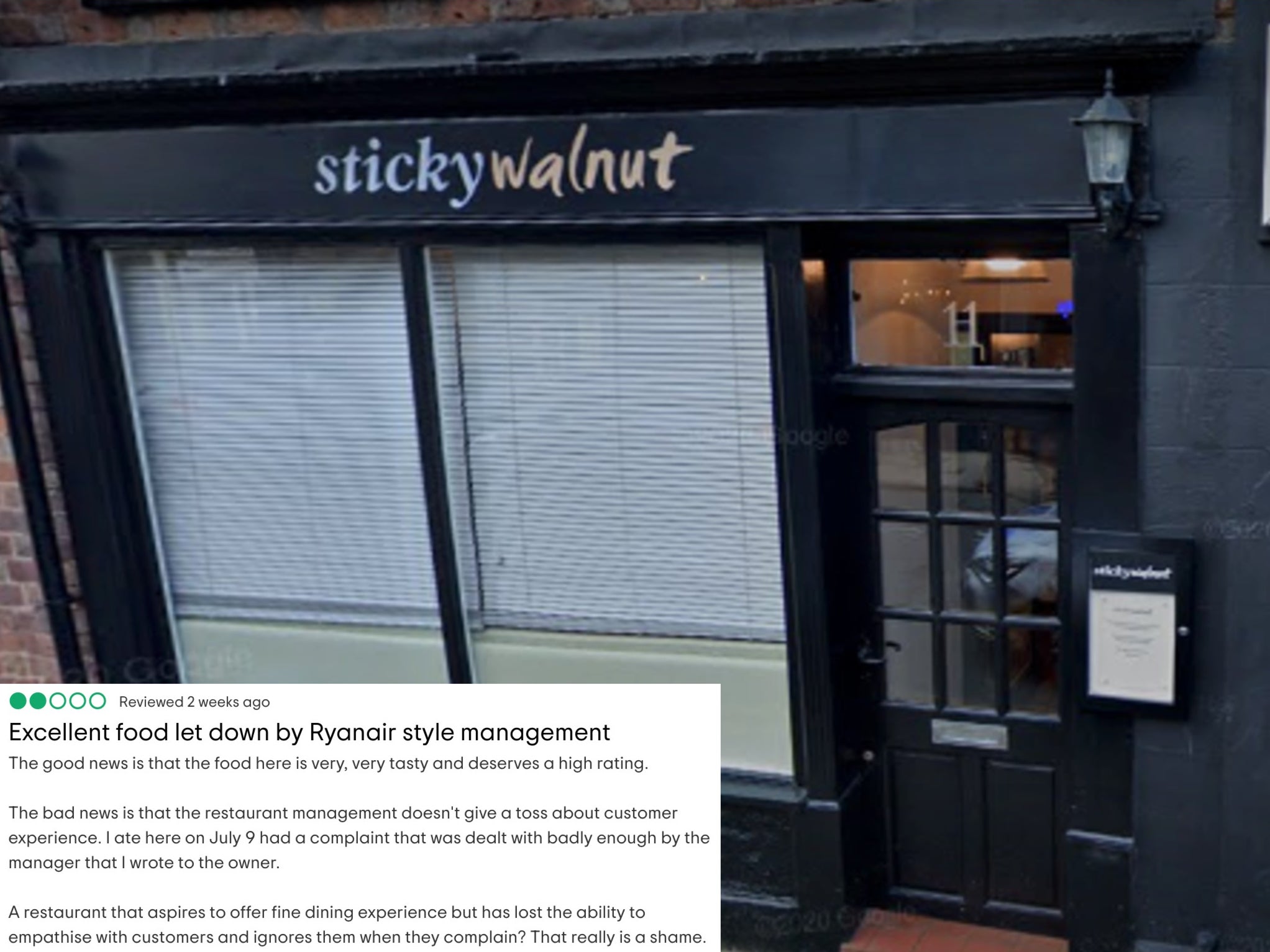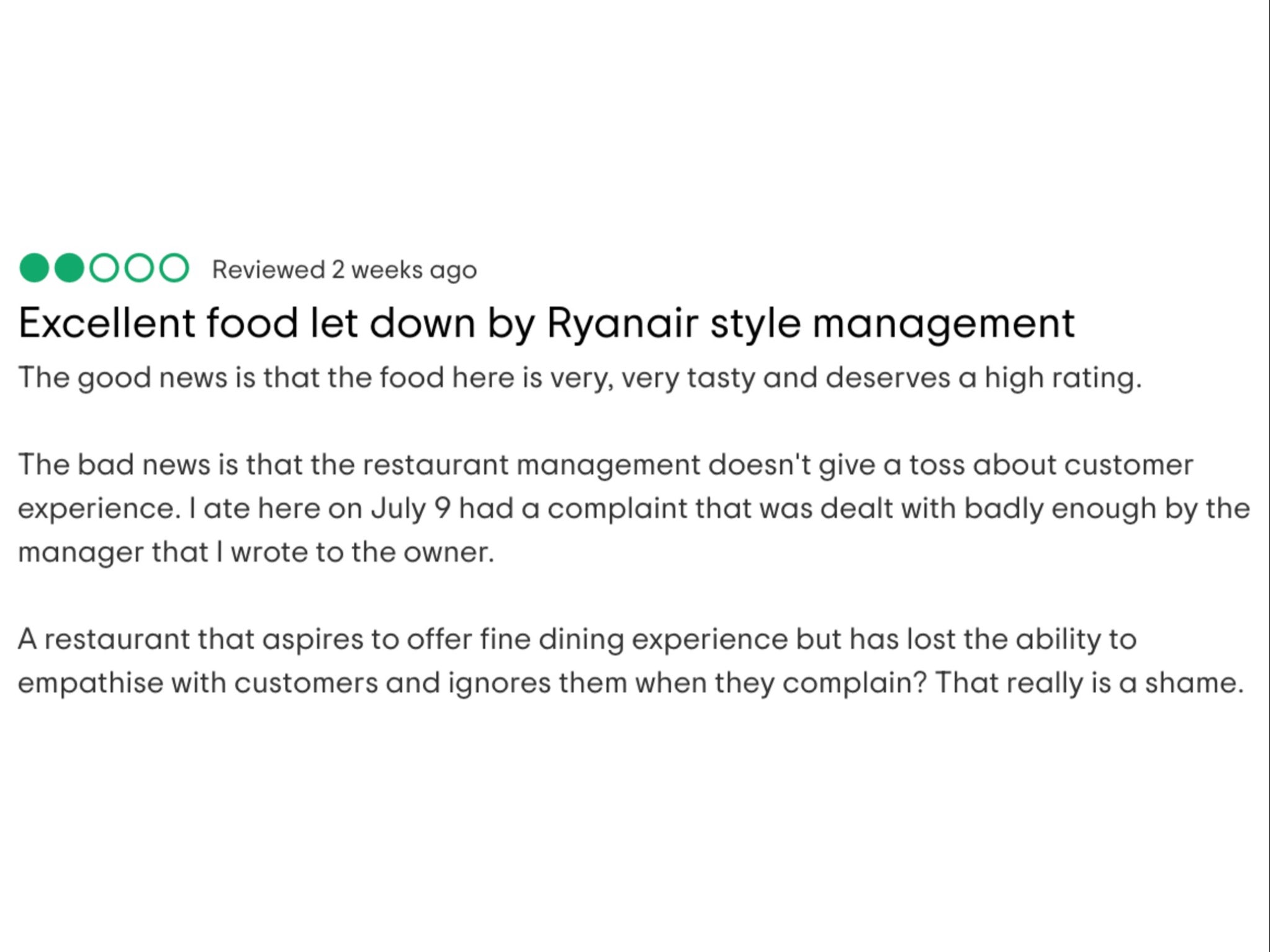 “I ate here on July 9 [and] had a complaint that was dealt with badly enough by the manager that I wrote to the owner,” he wrote.