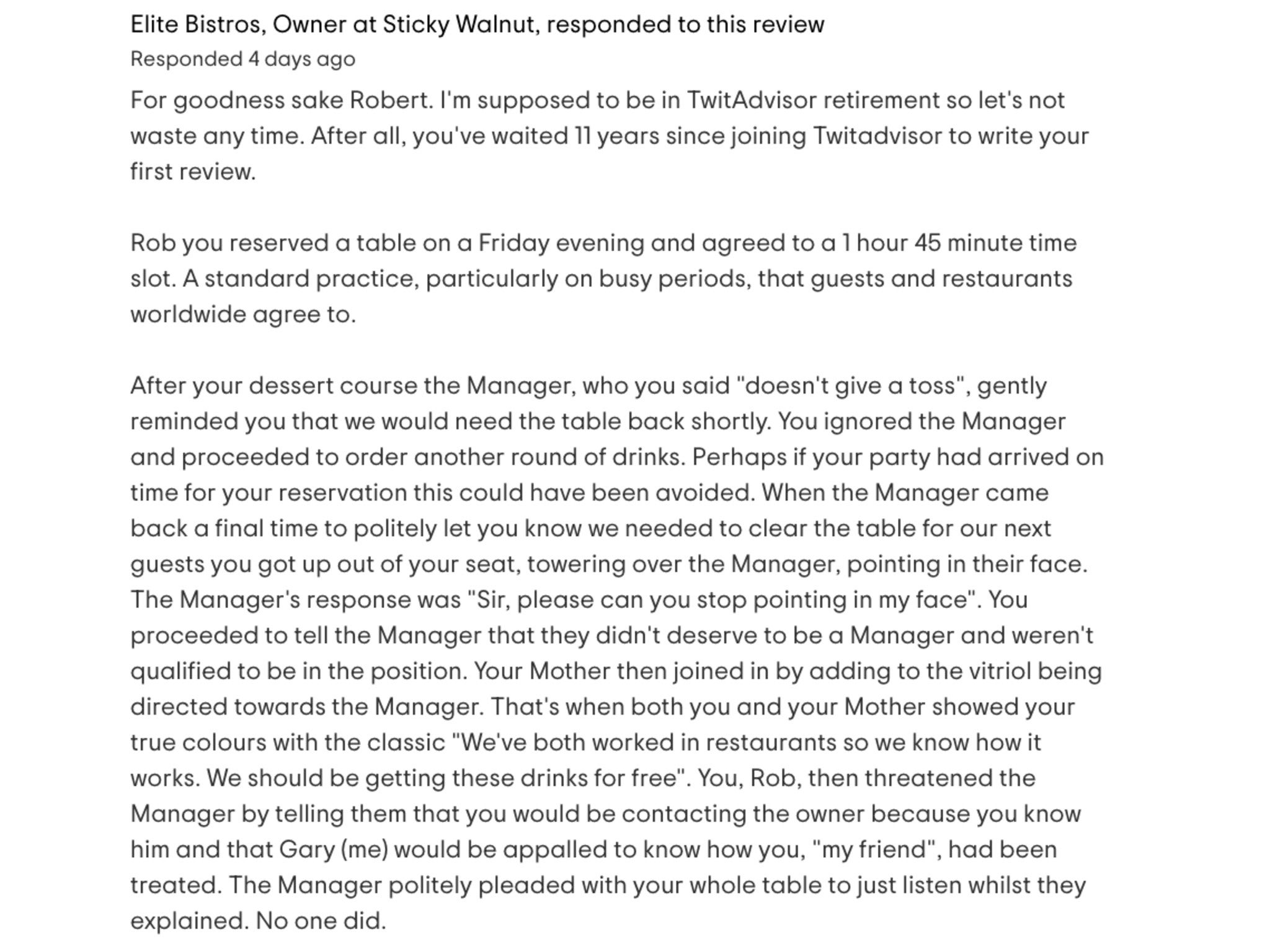 “Perhaps if your party had arrived on time for your reservation this could have been avoided,” he continued. “When the Manager came back a final time to politely let you know we needed to clear the table for our next guests you got up out of your seat, towering over the Manager, pointing in their face.”