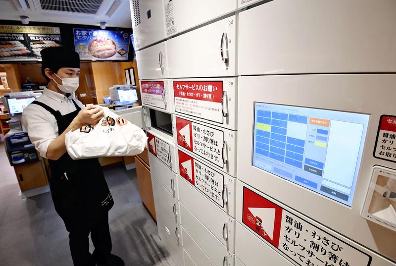 At the Sushiro outlet in Yurakucho, Chiyoda Ward, Tokyo, which opened last month, lockers were set up so that customers could buy sushi for takeout without having to interact with employees. Some outlets have installed a device to guide customers to their seats using an automatic reception machine.