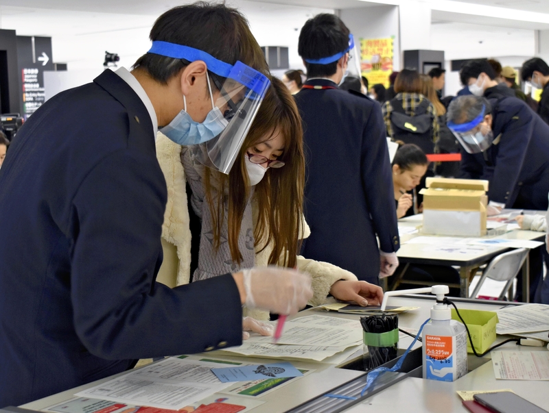 When people from those 38 countries -- in addition to China and South Korea -- entered the country, they were taken to special quarantine stations at Narita Airport. Quarantine officers and others wearing masks have the entrants fill out a health card to confirm where they will be staying and how long they will be in the country while requesting that they refrain from taking public transportation.