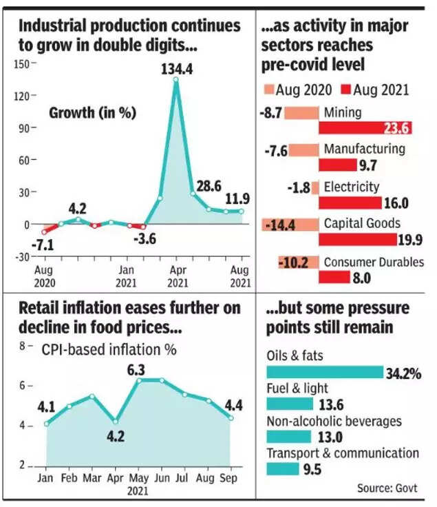Separate data showed industrial production growth for August was at a robust 11.9%, marginally higher than the 11.5% recorded in July. Economists said a comparison with the 2019 IIP data showed that industrial activity touched the pre-pandemic level.