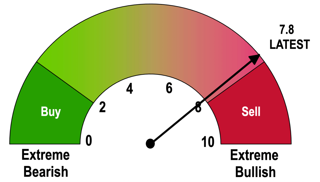 Michael Hartnett and his colleagues at Bank of America see it as a sell signal. Their “Bull & Bear Indicator”—a gauge that measures “investor fear and greed” from technical market data such as fund flows—now stands at 7.8, just below the “extreme bullishness” level that suggests it might be a good time to cash out: