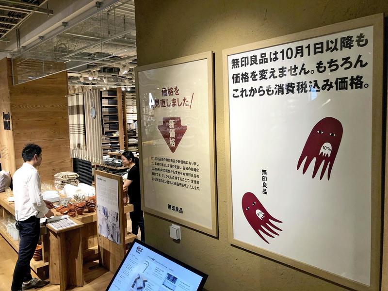 Ryohin Keikaku Co., which runs Muji Stores, has displayed posters in its stores since mid-September saying, "Our prices won't change after Oct. 1." It will reduce its pre-tax prices in order to make the tax-inclusive price at 10 percent tax equal to the current price with 8 percent.