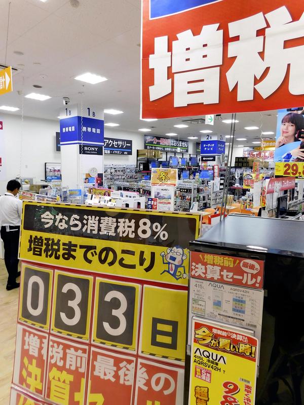 The Ario Kitasuna store of large electric appliance retailer Nojima Corp. in Koto Ward, Tokyo, put up a sign Friday indicating that there were "33 days left until the tax hike." As Nojima uses electronic price tags in its stores, the displayed prices will automatically change over to reflect the higher consumption tax on Oct 1.