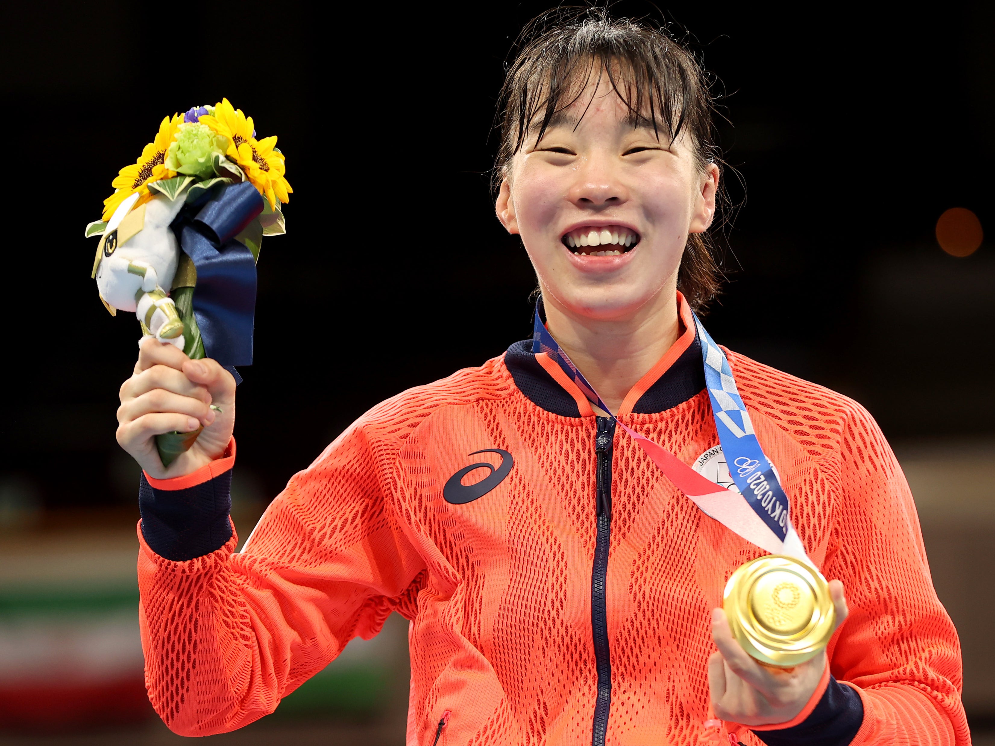 Women’s Feather (52-57kg) gold medalist Sena Irie of Team Japan poses with her medal during the Victory Ceremony on day eleven of the Tokyo 2020 Olympic Games at Kokugikan Arena on August 03, 2021 in Tokyo, Japan.