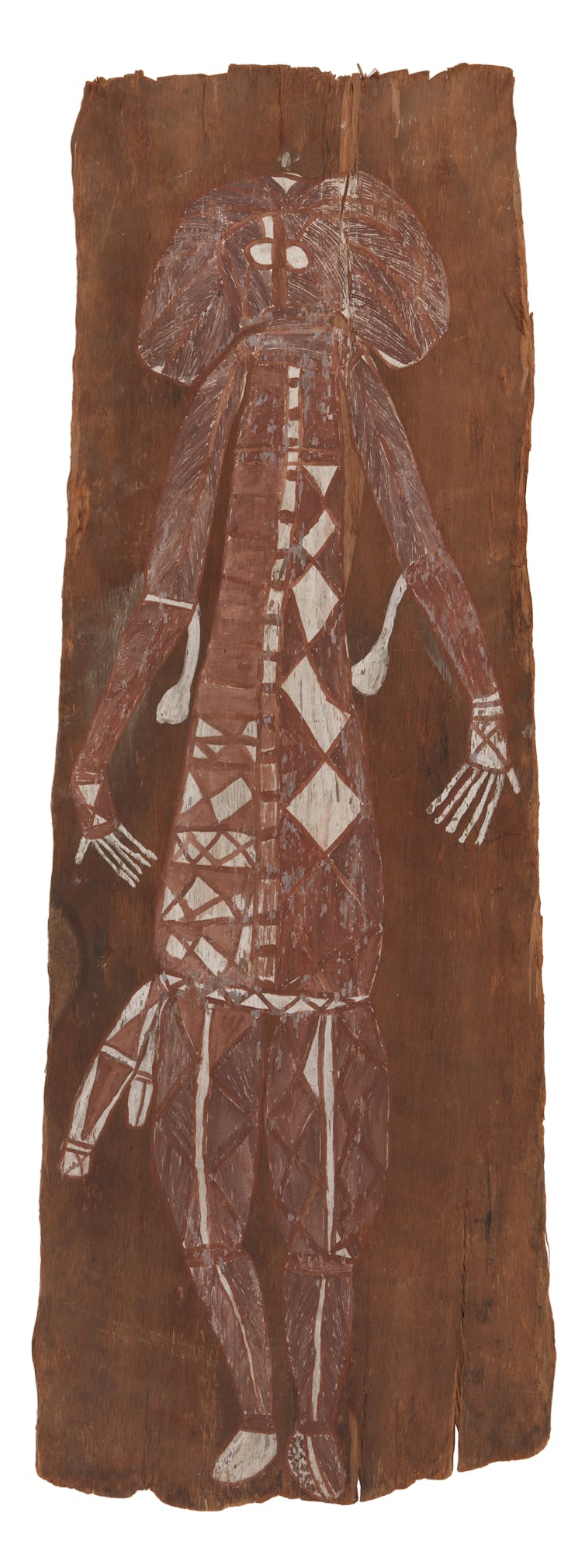 The largest bark in the Melbourne Museum’s Spencer-Cahill Collection is dominated by a painting of a crocodile that measures 2.94 metres by 1.03 metres. It is almost identical to a rock painting known to have been painted by Majumbu in a rock shelter where his family regularly camped.