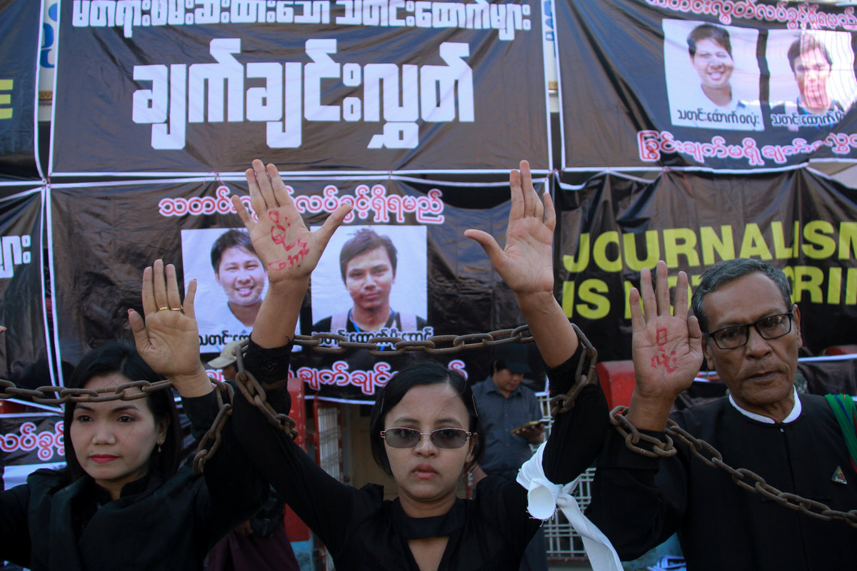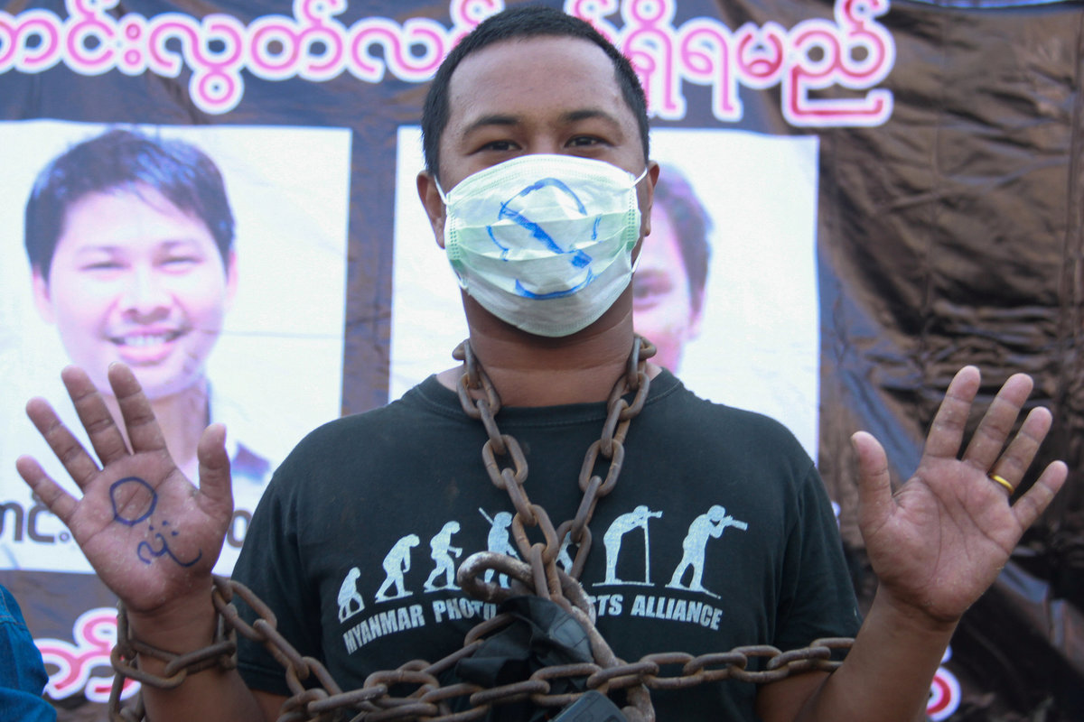 Members of the Protection Committee for Myanmar Journalists sat draped in chains in a public square in the centre of the town and wrote the names of the two arrested reporters on their palms, an often used symbol in Myanmar of solidarity with those in jail.