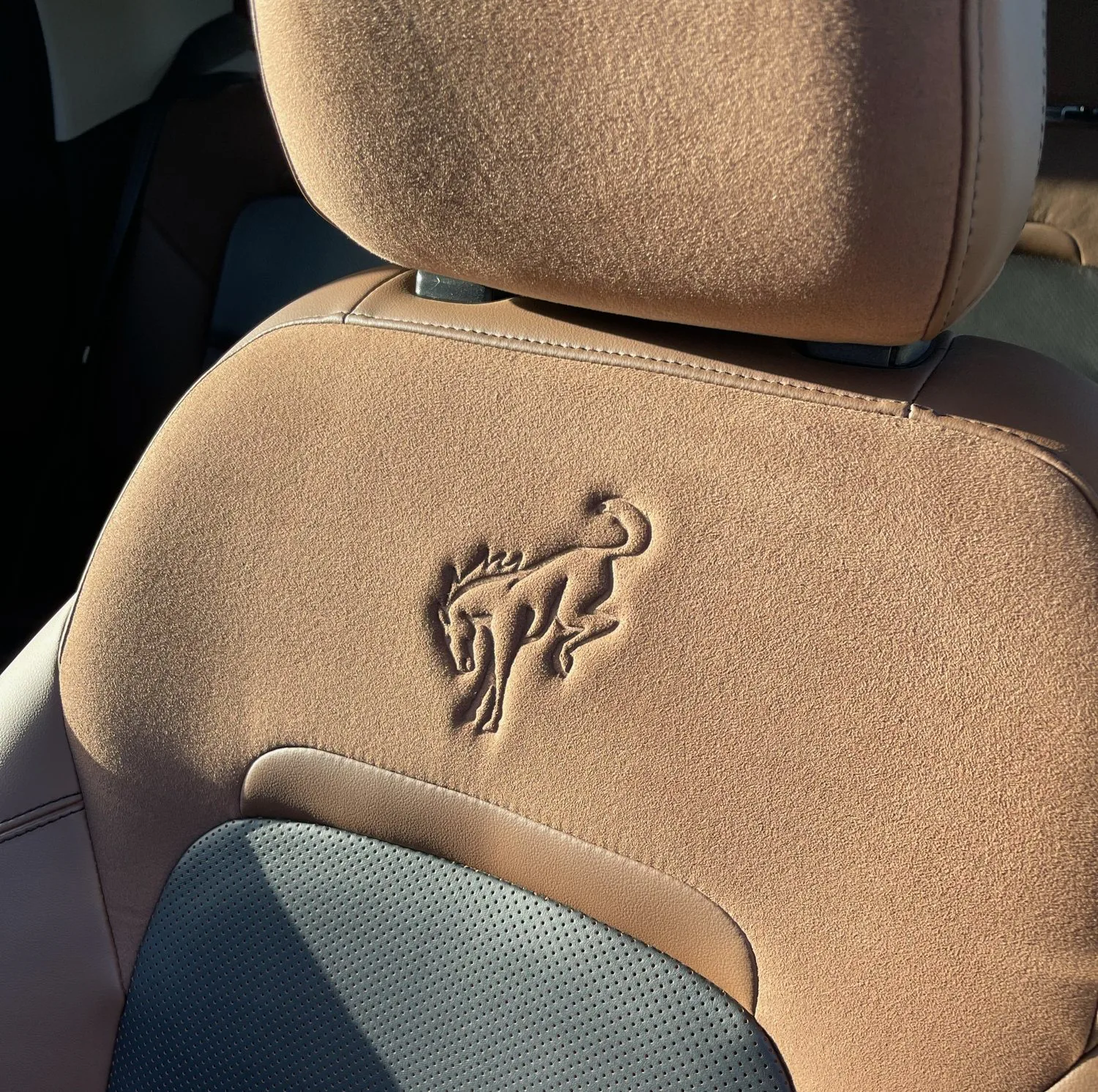 Ford wants you to know that this is a Bronco so badly that there is but a single blue oval on the car (on the rear tailgate). Everywhere else — the seats, the steering wheel, the wheel caps — that you might find a carmaker’s mark, you have the Bronco logo instead. The embossing on the seats is particularly nice, especially if you catch it just right in golden hour sunlight.