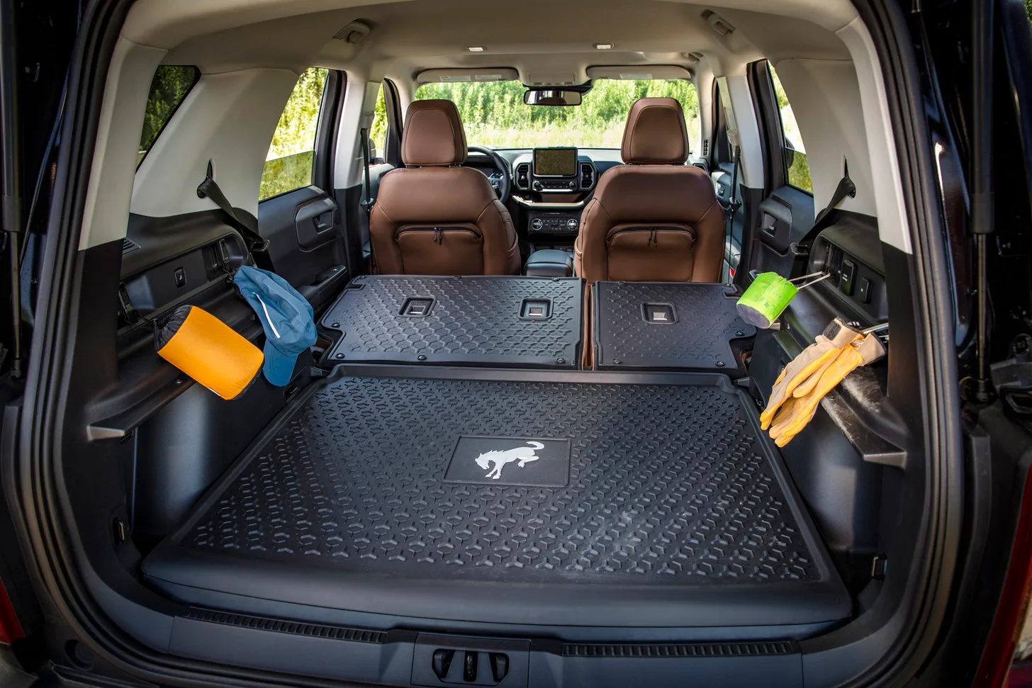 Another bin below has a wireless phone charger, which is perfect because the Bronco Sport has wireless Apple CarPlay and Android Auto. And there's webbing on the side of the center console to hold maps or your phone or whatever else.