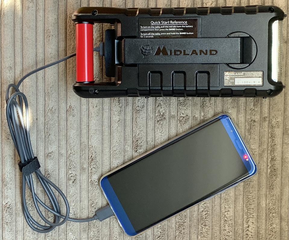 Pull back the rubberized flap that covers the ports and you’ll find a headphone jack, and a Micro USB port used for charging the radio (Midland supplies the cable, but you’ll need to use your own charger). There is also a USB Type-A port, so the radio’s 2600 mAh battery can be used to top up the charge on your mobile device.