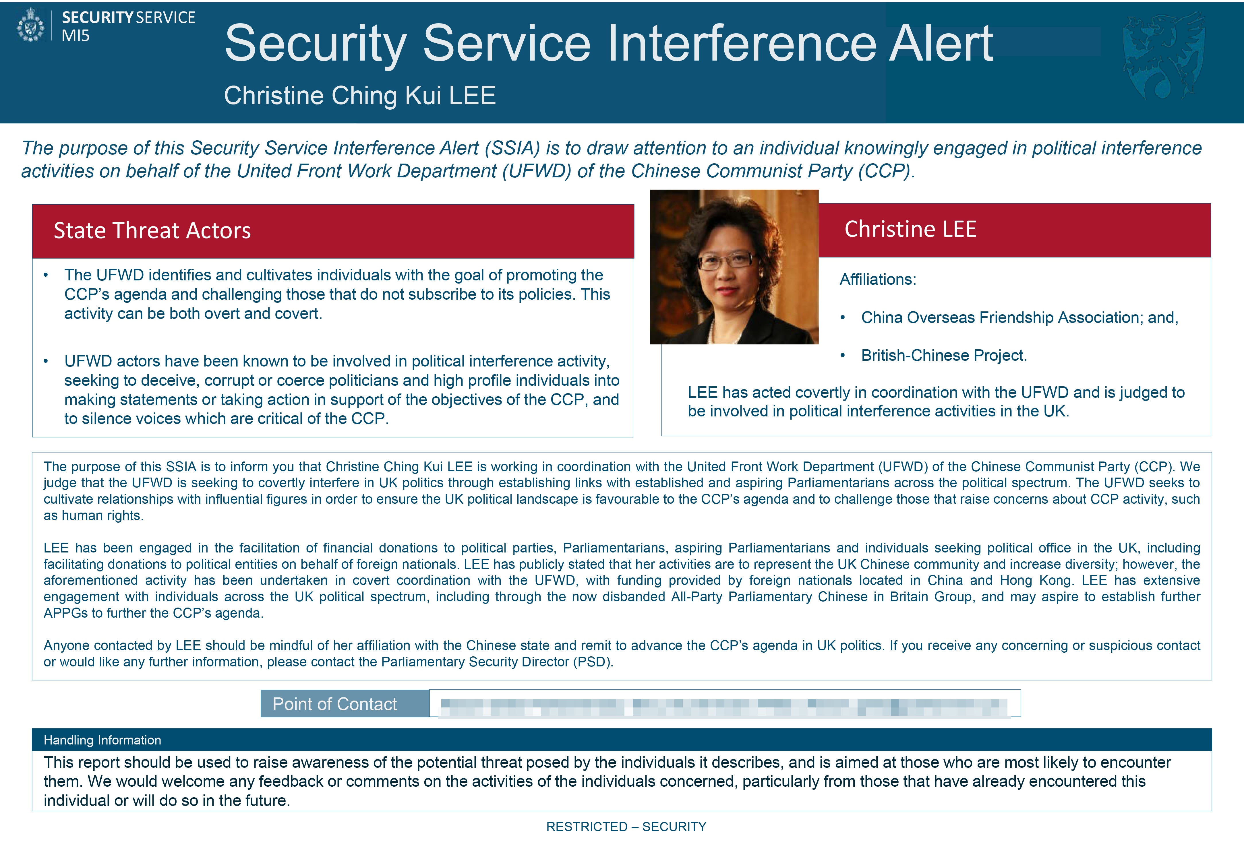 In the Security Service Interference Alert (SSIA) sent to MPs and peers, MI5 said Lee “acted covertly” in co-ordination with the United Front Work Department (UFWD) of the Chinese Communist Party (CCP).