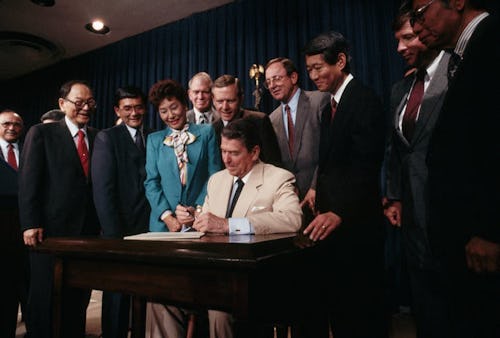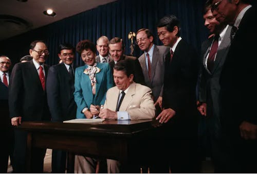 After the bombing of Pearl Harbor in 1941, President Franklin Delano Roosevelt sent tens of thousands of Japanese Americans to internment camps. In the years after the war, advocates, including the children and descendants of those interred, launched a lengthy campaign, ending with President Ronald Reagan’s making a formal apology and signing 1988’s Civil Liberties Act, through which each survivor was paid $20,000 each, around $44,000 in today’s money.