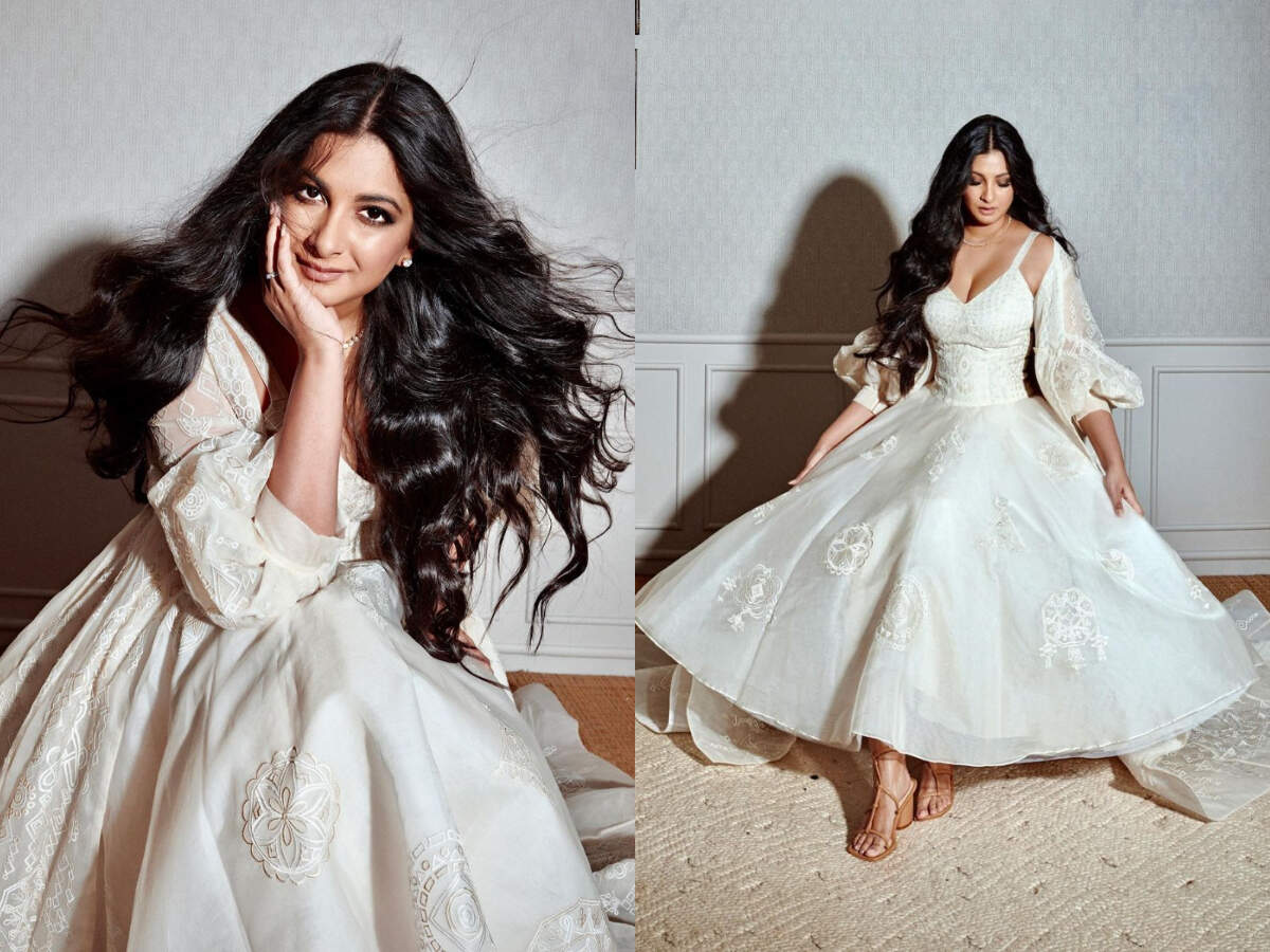 Rhea looked radiant in an off-white gown by designer duo Abu Jani Sandeep Khosla. The ivory gown dress featured delicate embroidery, a thin strap and a corset like structure on the top which broke into a flowy balloon dress from below the waist. The dress came with what seem like detachable balloon sleeves and made Rhea look like a modern day princess.