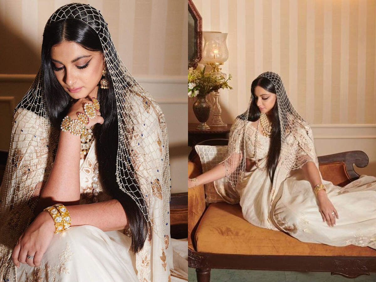 Celebrity stylist Rhea Kapoor has finally shared her wedding look on her social media. The 34-year-old wore a striking off-white, chanderi sari from designer Anamika Khanna. She accessorised her look with pearl neckpieces and earrings from her mother Sunita Kapoor's collection. It was her pearl veil from Birdhichand Ghanshyamdas that stood out.