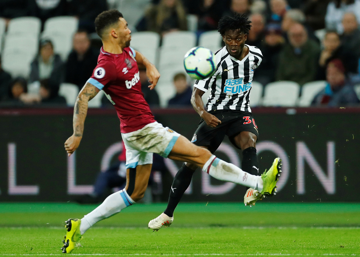 Soccer Football - Premier League - West Ham United v Newcastle United - London Stadium, London, Britain - March 2, 2019 Newcastle United's Christian Atsu in action with West Ham's Ryan Fredericks REUTERS/Eddie Keogh