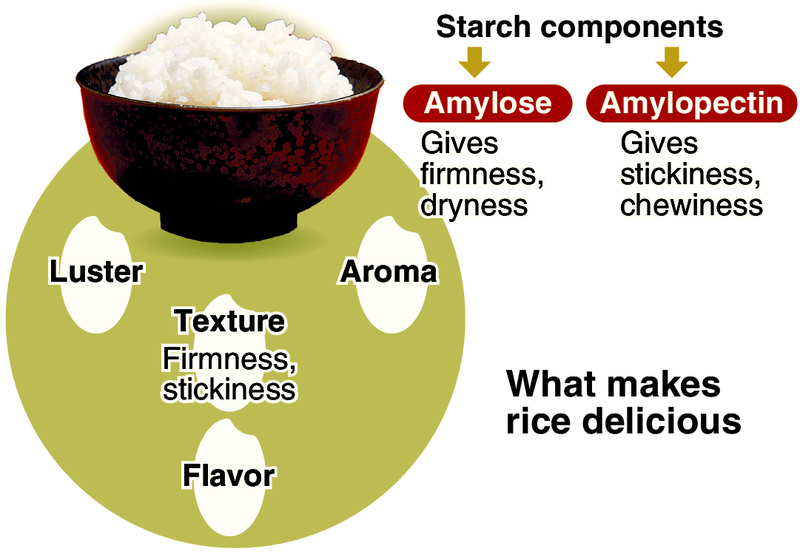 Koshihikari rice, which has dominated rice acreage in Japan for about 40 years, contains relatively small amounts of amylose and has a sticky texture. It is favored by contemporary Japanese consumers.