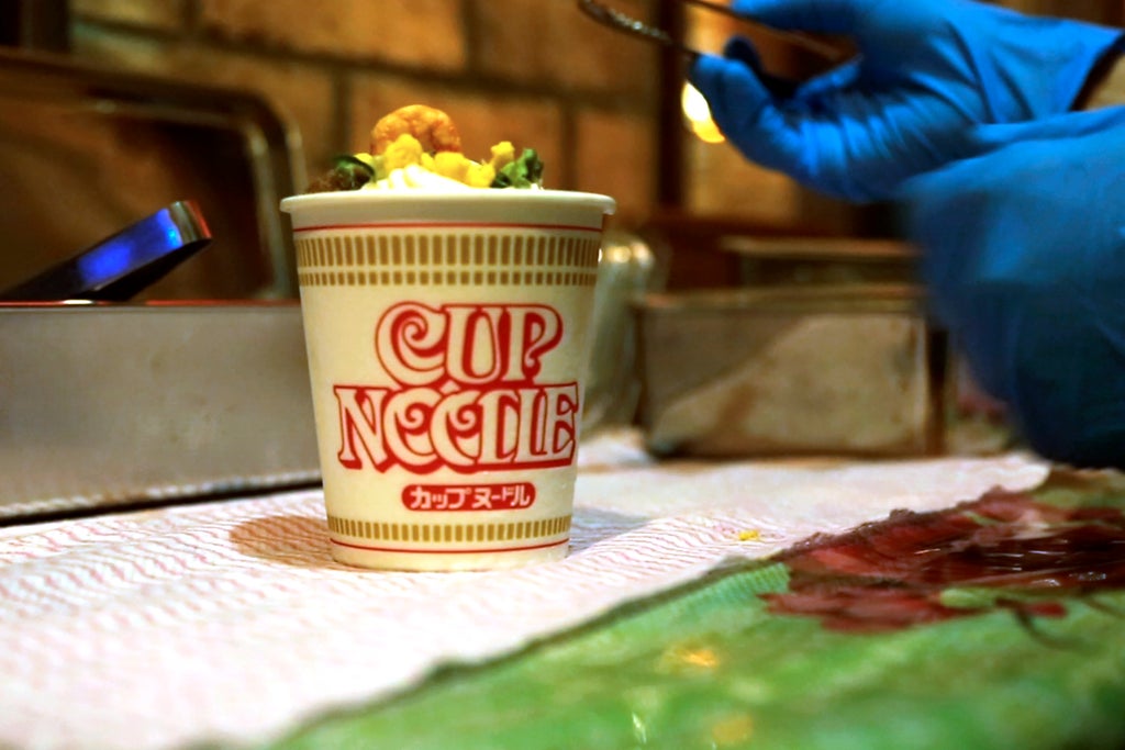Served only at the Cup Noodles Museum, in its fourth floor cafeteria, it's made with the same powdered soup and freeze-dried toppings — onion, shrimp, chunks of egg and meat — used in actual Cup Noodles.