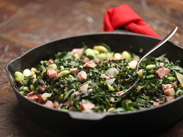 Pork, greens and beans make tasty companions as each one complements the others. In this version, salty ham flavors the earthy lacinato kale as the starchy limas work backup. The combo is good alone and better with a fried egg on top. For a refreshing match, you'll want a wine that cuts through the fat and salt of the dish.