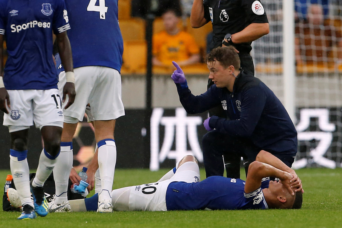 Soccer Football - Premier League - Wolverhampton Wanderers v Everton - Molineux Stadium, Wolverhampton, Britain - August 11, 2018 Everton's Richarlison receives treatment from medical staff after sustaining an injury Action Images via Reuters/Craig Brough