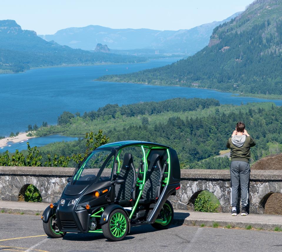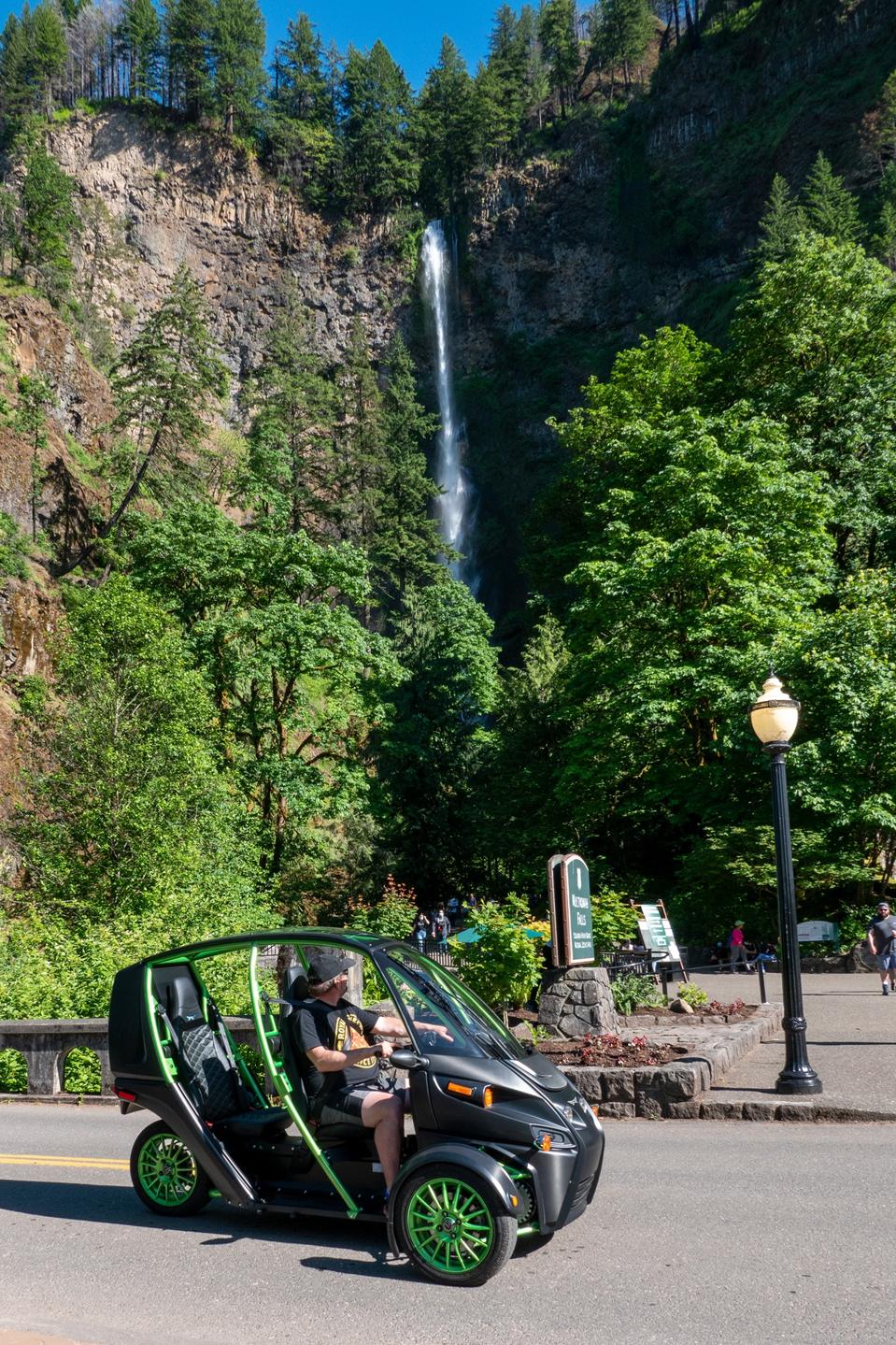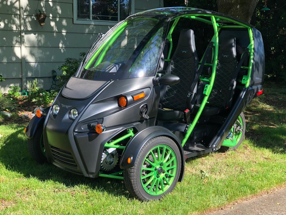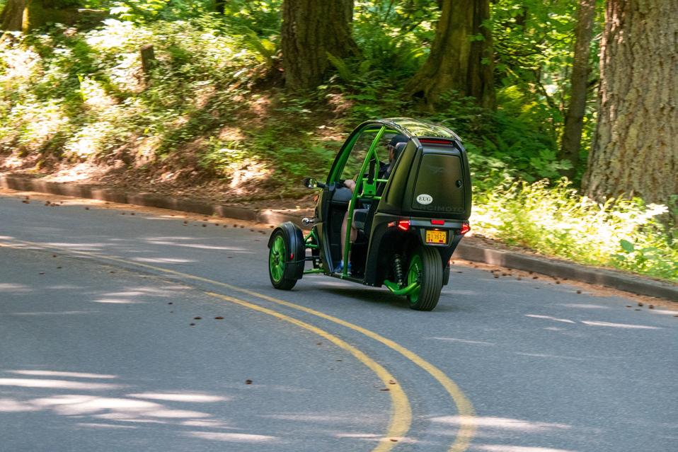 As noted, the FUV I had in for review is the base unit produced by Arcimoto. It has two wheels in front and one out back, seats two people front to back rather than side to side like the Polaris Slingshot, and runs on electricity that powers two front motors - one for each front wheel. It’s 80 inches across and 113 inches long, so while it has a footprint, it’s still fairly small compared to even a compact car. It has a motorcycle-style handlebar and twist throttle rather than a steering wheel and gas pedal, and it is classified as a motorcycle in Oregon. However, since it is “full enclosure” (it has a DOT-spec roll bar and transparent roof - and even a windshield wiper), you are not required to wear a helmet to drive it or ride in it in Oregon. My machine (Frohnmayer says it’s called “The Hulk” due to the colors) had no doors but doors are an option. Summer was in full swing when I got it, so I didn’t miss having the doors.