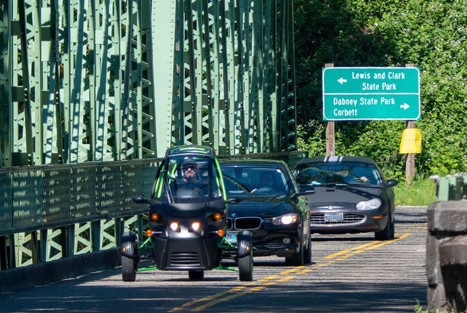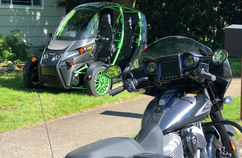 The experience of taking the FUV on a longer ride is much more akin to a motorcycle experience than the Slingshot or SOLO, certainly due to the handlebars but also because you sit “up” in the FUV at about the same ride height as a crossover SUV. And since you’re out in the open save for the transparent roof and windscreen, you really feel much more like you’re on a touring motorcycle.... without being on one. Which is interesting, as Mark told me at a recent EV event in Portland that he’s never ridden a motorcycle, and was forbidden by his parents to own one. I was as well, but I was far less obedient than Mark, apparently.