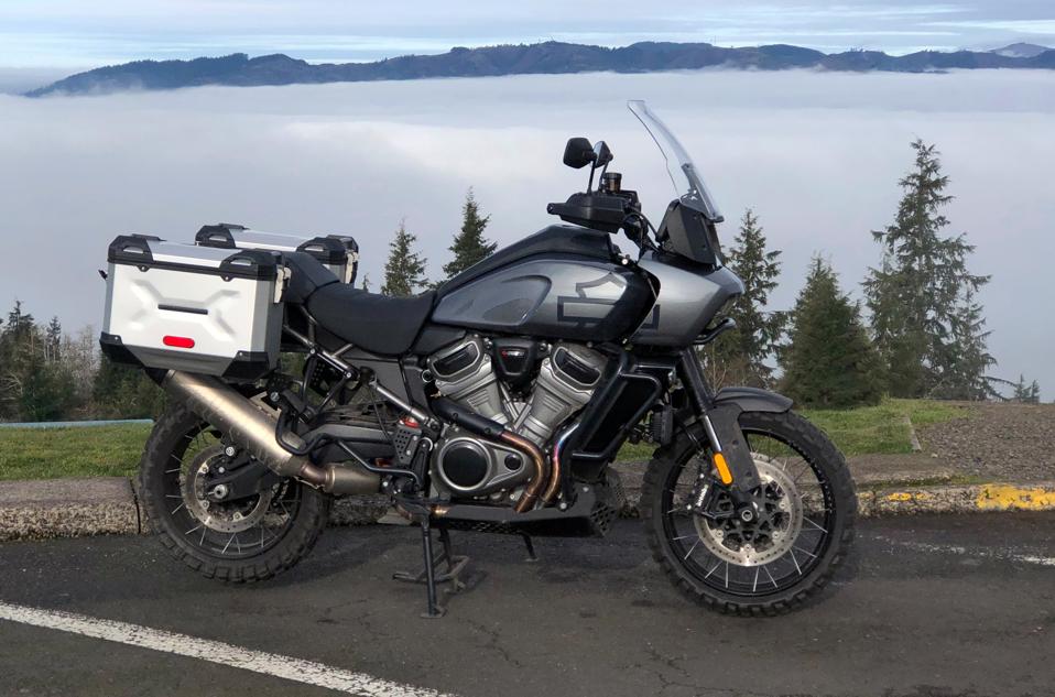 My bike has over 4,000 likely indelicate press rider miles on it, so I feel free to spin up the motor to its 9,000rpm limit and rifle through the truly slick-shifting gearbox, and the Pan America rockets out of corners and blows through triple-digit velocities on the undulating straightaways. Instead of a typical Harley high-decibel exhaust symphony, a dull roar from the OEM-upgrade Screaming Eagle 2 to-1 exhaust is nearly drowned out by wind blast. This bike is thankfully not about The Noise, and I’m fairly hooting in my helmet with joy as I ascend through corridors lined with towering redwoods and Douglas Firs.