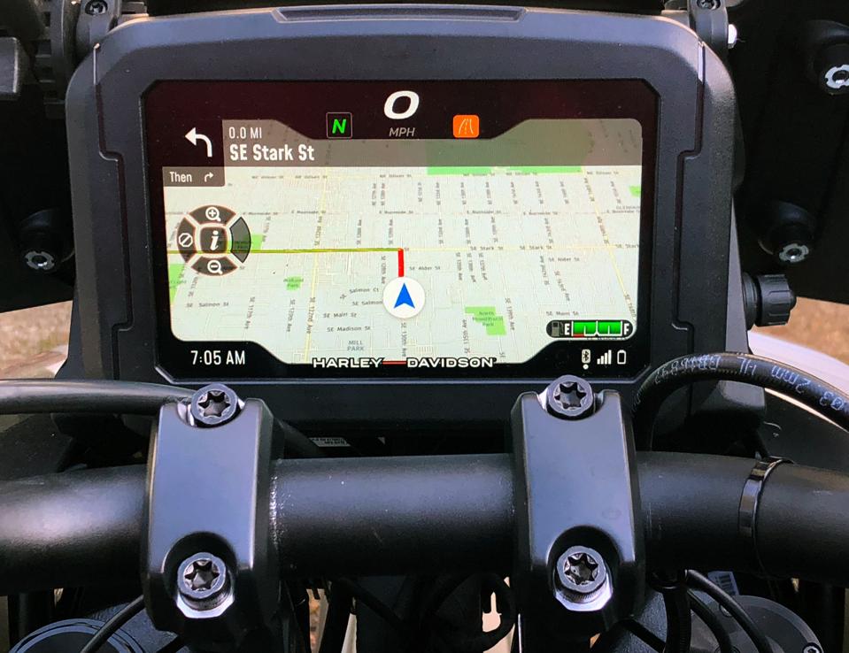 And while the handlebar pods are awash in buttons, they are at least of their own design, with a “normal” turn signal switch on the left bar instead of Harley’s traditional (and sometimes confusing) one-signal-button-per-side configuration. The engine start/stop button is in a bit of an odd spot atop the right pod, but after weeks of riding, I found that Harley has done a good job of putting the most-used buttons in the best spots, and after awhile, I could pretty much operate most functions by feel. Lone complaint: The high-beam toggle on the left pod is a bit too easy to toggle, and I often accidentally activated the very bright high beams while fussing with other buttons.