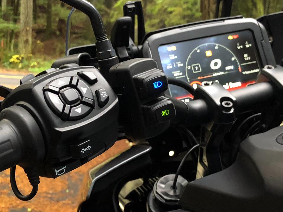 For a first-year, Version 1.0 pure adventure bike from a company that has never made one before, there’s surprisingly little to complain about. The fonts on the LCD screen are too small in places (I’ve been told a software/firmware fix is likely in the works), and the right side exhaust pipe is angled up so that the right side pannier has to be smaller than the left case. Looking at it, if the exhaust was angled down just a touch, it seems a full-size case would easily fit. The windscreen height adjustment lever works but it could be better, and light from the top LED adaptive headlight array reflects a bit of bright light off the bottom of the windscreen mount toward the rider at night. The handlebar pods have a lot of buttons on them, but the more I used them, the more they made sense, for the most part.